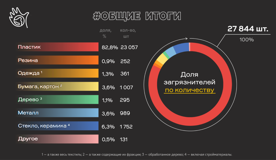 Выяснилось, что почти 83% фрагментов мусора — это пластик, причем на побережье его доля еще выше — 91%. На берегах Финского залива и Баренцева моря обнаружили примерно в равных пропорциях отходы курения, пакеты и мягкую упаковку от еды, бутылки и крышки. В лесах и парках большая часть пришлась на пакеты и упаковку: 41%. Также среди пластикового мусора были рыболовные снасти и предметы гигиены.