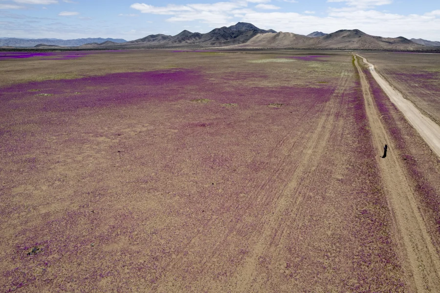 Самая засушливая пустыня в мире — Атакама, расположенная на севере Чили — снова зацвела, покрывшись ковром из преимущественно розовых и фиолетовых цветов.
