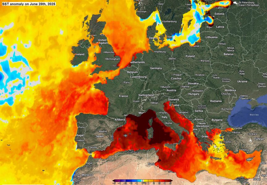 К концу июня средняя температура поверхности воды Средиземного моря превысила 26°C, что на три градуса больше, чем за период 1991–2020 годов. Местами отклонения от сезонной нормы составляют 5-6 °C, а пиковое значение достигло 29,85 °C, следует из данных службы спутникового мониторинга Copernicus.