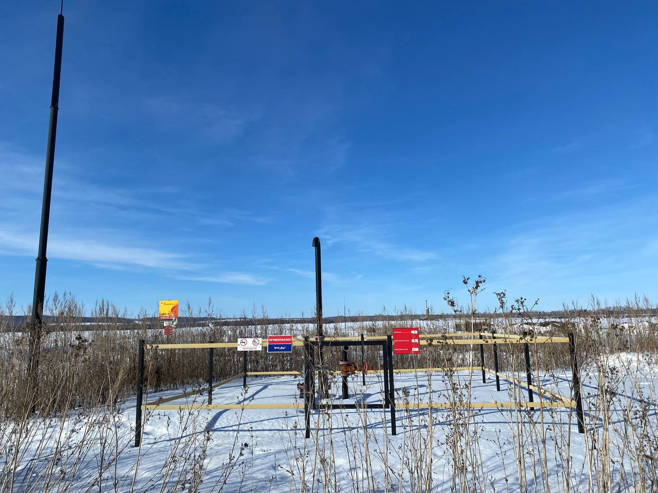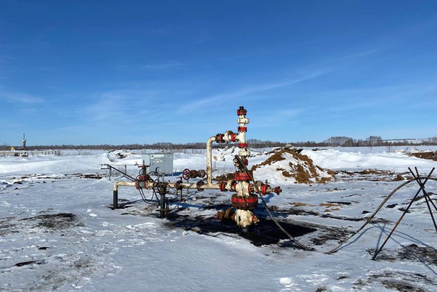 Из-под покрытой снегом земли выглядывают черные и красные трубы. В воздухе стоит слабый запах нефти. Эта скважина близ Большой Раковки была установлена в 2024 году. Еще одну пробурили вдали — возле поселка Гундоровка. Туда, признается Ирина, она давно не ходила, потому что ей «стыдно».