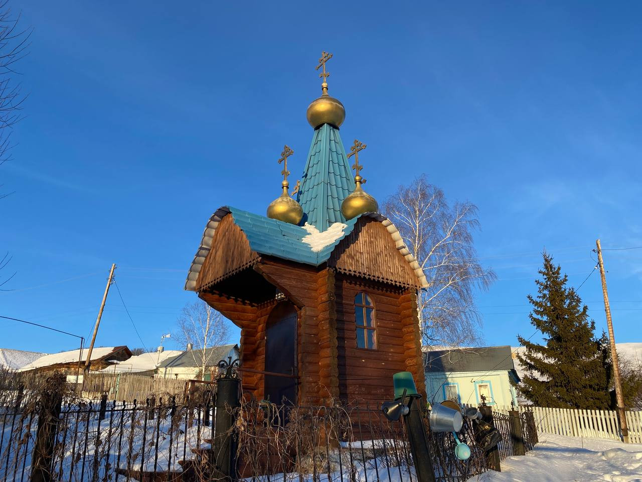 Деревянный домик у подножия трех холмов обрамлен золотыми куполами. На заборе повешены кружки, бутылки и ведра. Это святой источник Владимирской иконы Божией Матери — сюда часто приезжают паломники. Надежда родилась в Русской Селитьбе, знает в селе всех и делится, что в последнее время ей «стало страшно» из-за проекта по добыче нефти.