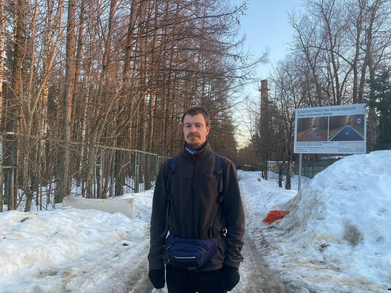 Вход в «Лосиный остров» со стороны Королева встречает стендом о благоустройстве прогулочной зоны. Идя по ней, слышишь, как щебетанье птиц то и дело прерывается гулом машин — пешеходная дорожка упирается прямо в новую трассу. Остановившийся возле дороги мужчина оглядывается и поспешно перебегает ее.