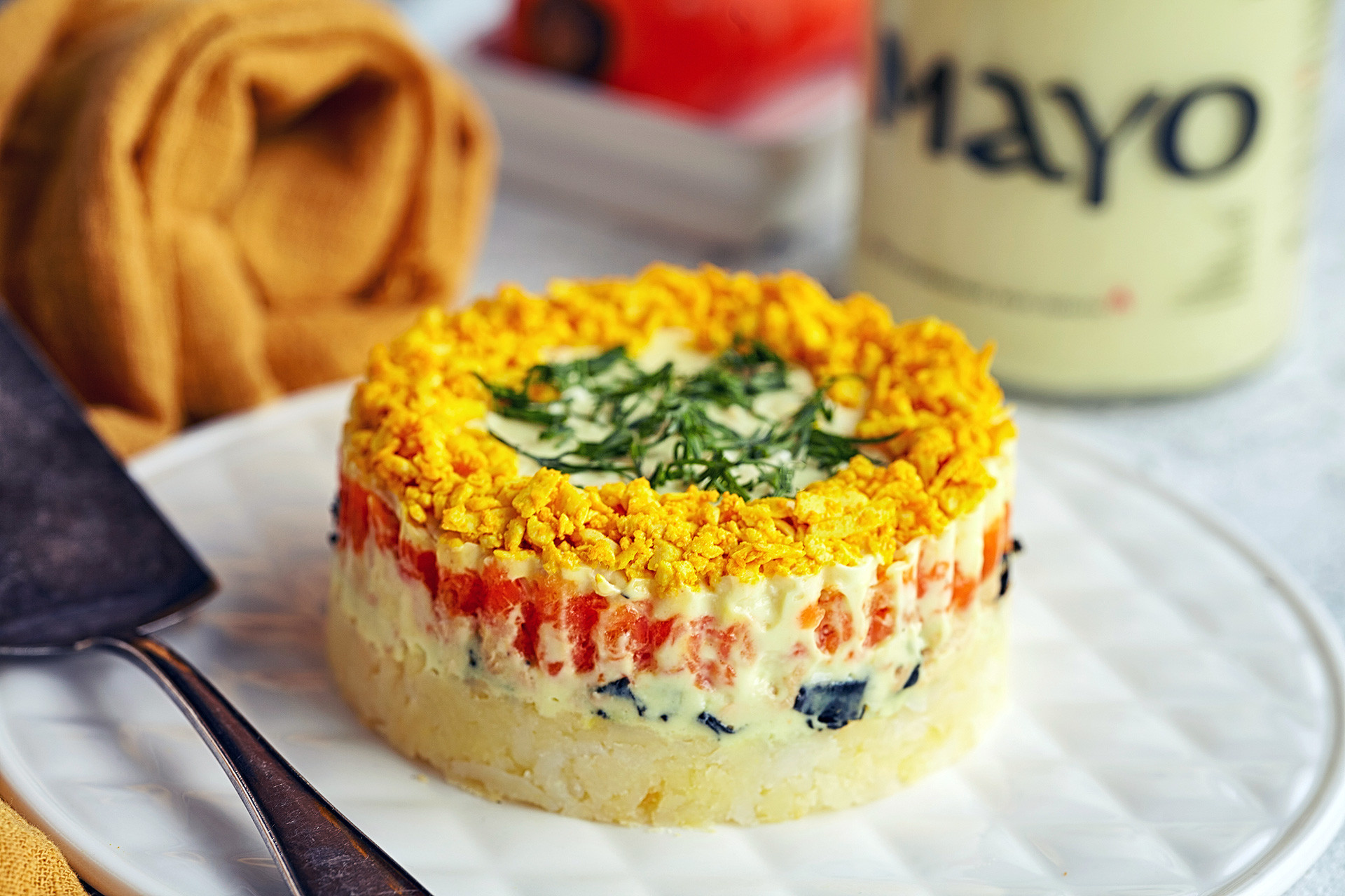 Выложить салат в блюдо слоями: «рыба» с луком, картофель, морковь, тофу с куркумой и гималайской солью. Каждый слой смазать майонезом.