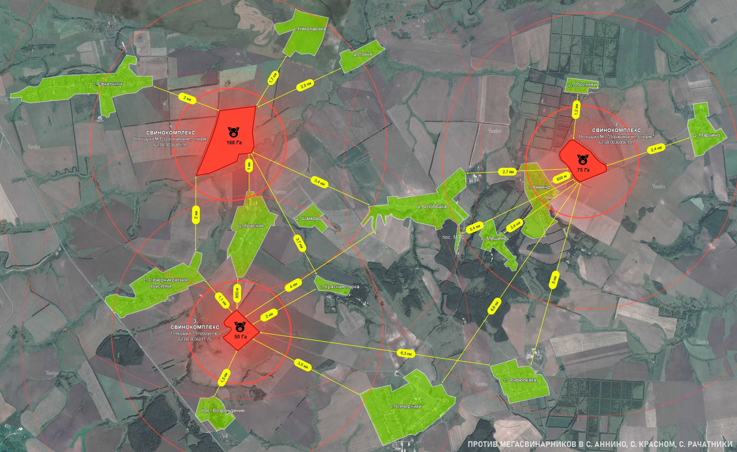 Всего в «зону поражения» свинарников, по подсчетам селян, могут попасть 40 населенных пунктов. Но шесть из них — Слободка, Красное, Шамово, Красная Горка, Мишино и Аннино — в случае, если комплекс будет построен, окажутся в наиболее тяжелом положении: они попадут внутрь треугольника из животноводческих ангаров. Для местных жителей будет даже не важно, в какую сторону дует ветер: от одного из свинарников зловоние до них точно доберется.
