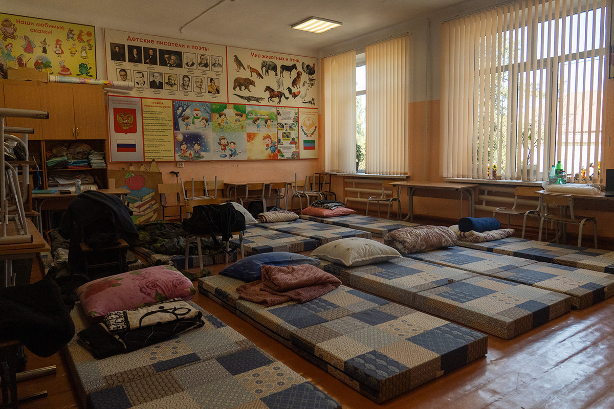 Фразу про народное единство повторяют все волонтеры и местные жители. Посвященная ему инсталляция из красных кубиков и лозунгов о дружбе и родине стоит в холле гимназии. После хаоса разрушенных улиц суета улыбчивых волонтеров позволяет выдохнуть. Здесь не спрашивают, откуда ты и зачем приехал, но всех приглашают в столовую подкрепиться. На длинных столах разложены фрукты, салаты, колбаса, печенье.