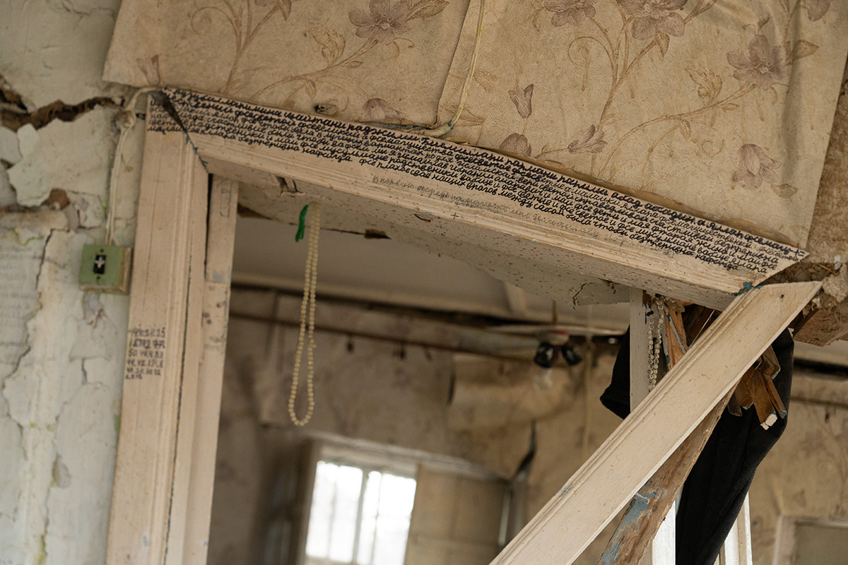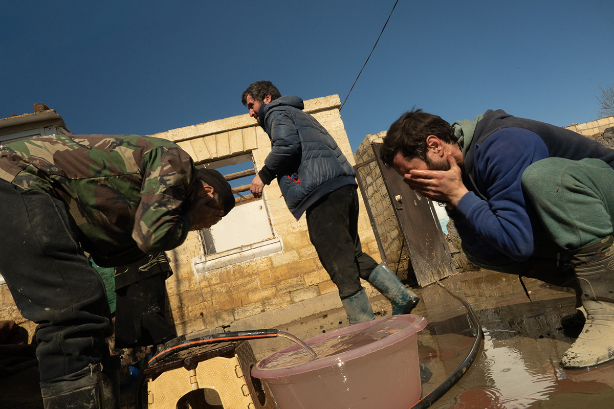 Мужчина с густой щетиной, помолившись, встает и проводит рукой по коричневой линии на обоях. Пару дней назад здесь на полтора метра стояла вода.