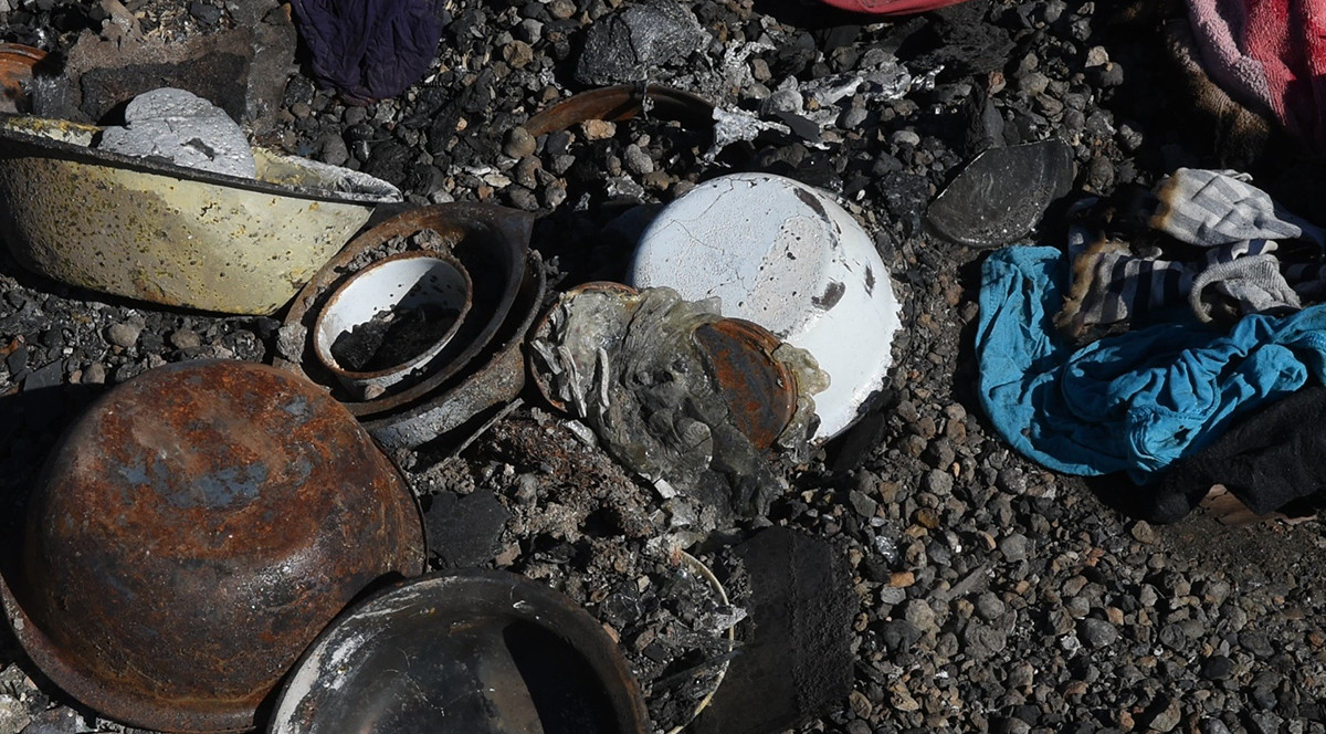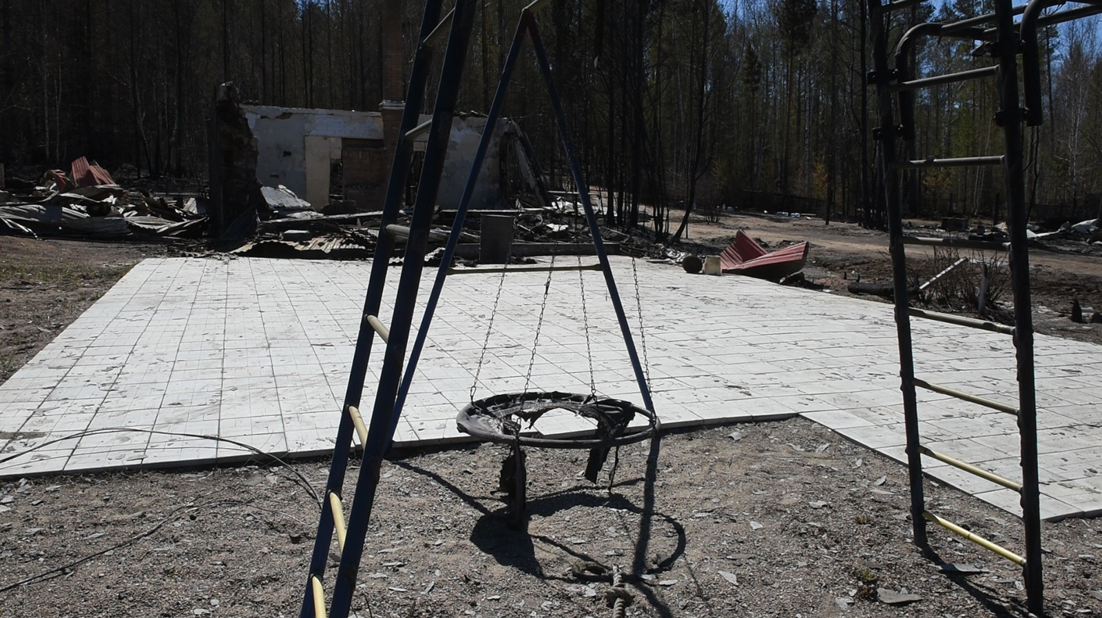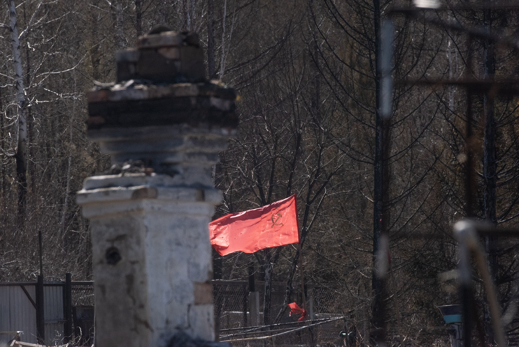 На пепелищах валяется обгоревшая посуда и остатки железных кроватей, над уцелевшим забором одного из участков возвышается советский флаг. Качается на ветру обожженная детская качель.