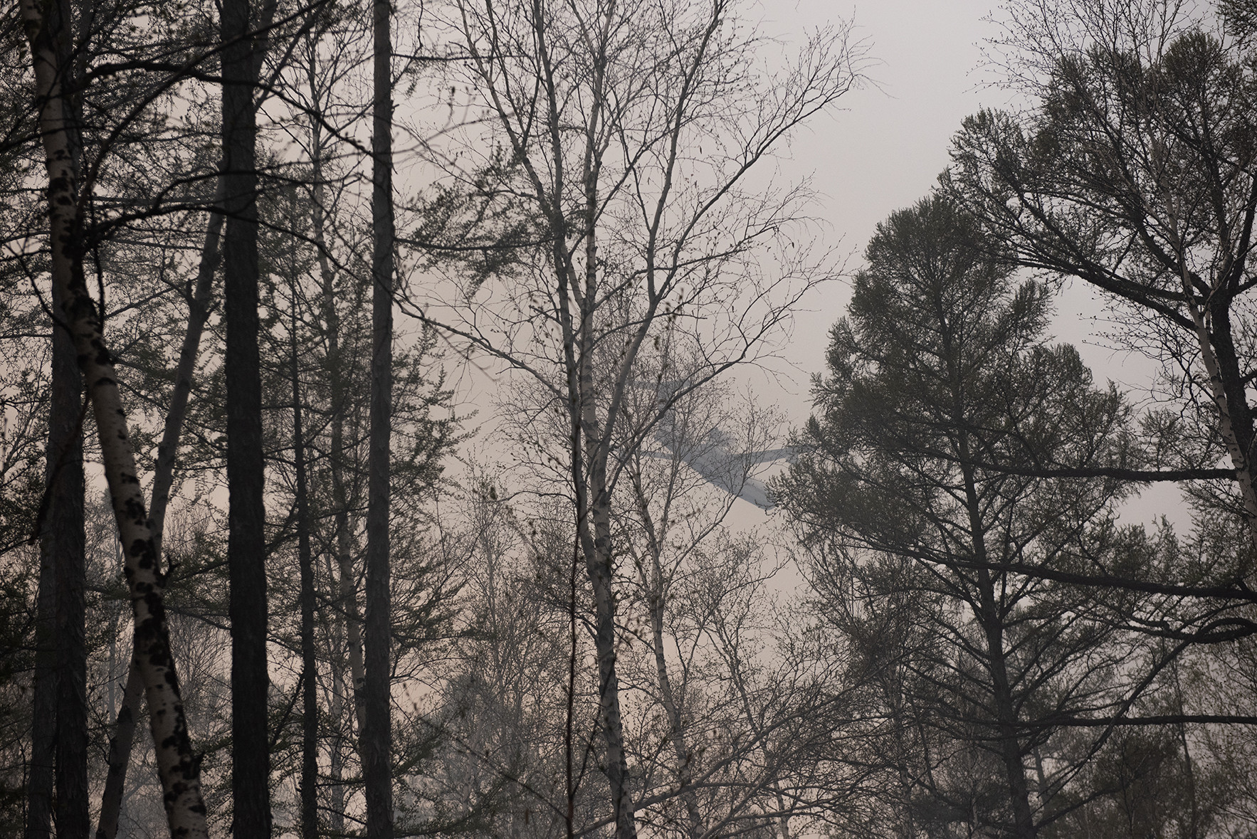 Ветер становится сильнее. Дым, стелившийся до этого по земле, поднимается до кромок деревьев, стоящих на окраине поляны. Пожарные заходят в него, превращаясь в силуэты.