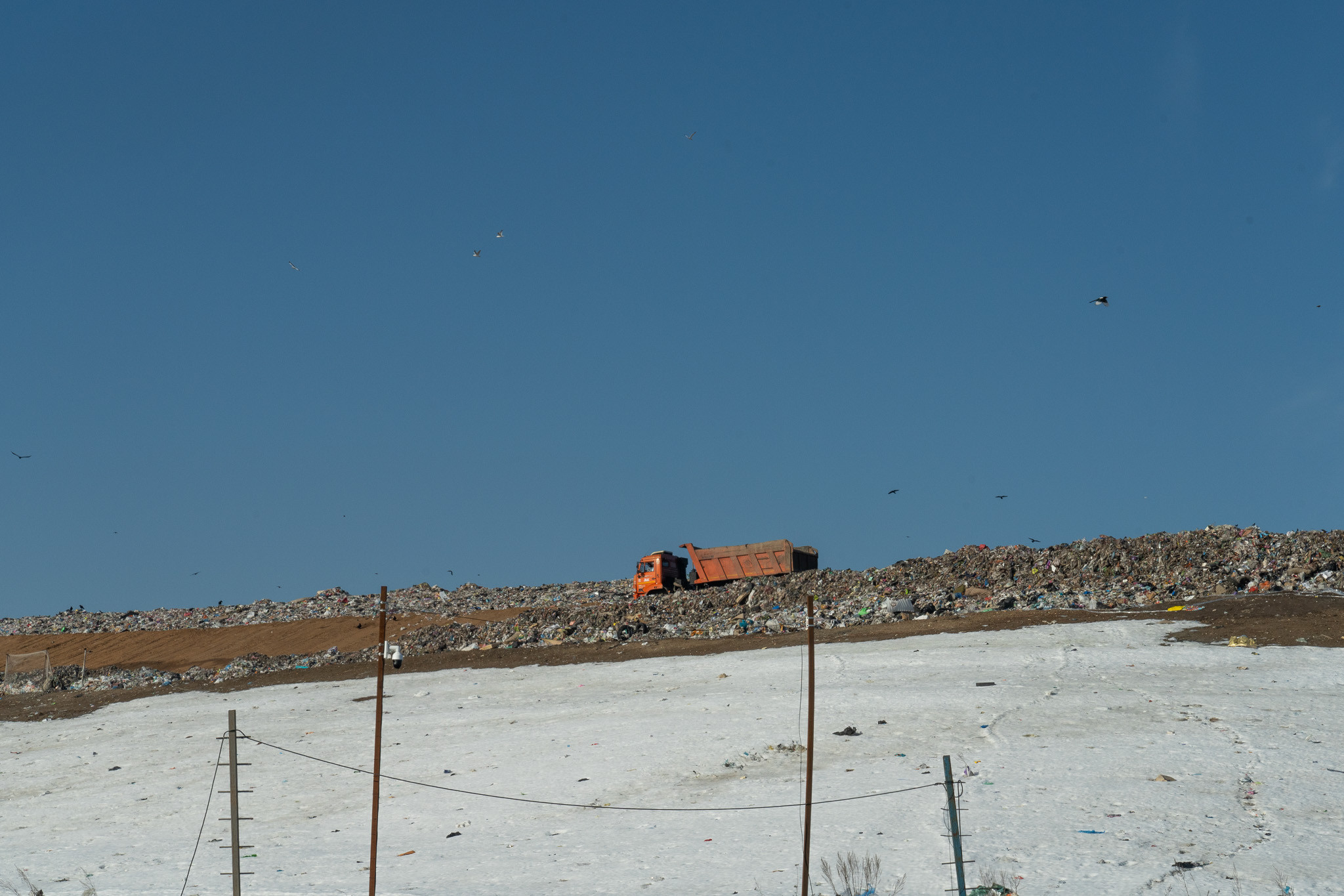Стая белых чаек кружится над огромной мусорной кучей несортированных отходов «Востока». Это третья карта захоронения. Первые две уже накрыли черной пленкой геомембраны, чтобы снизить интенсивность запахов.